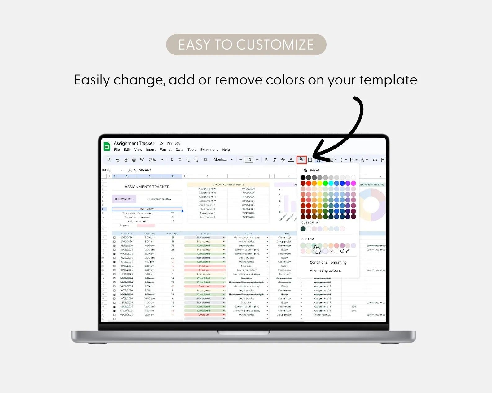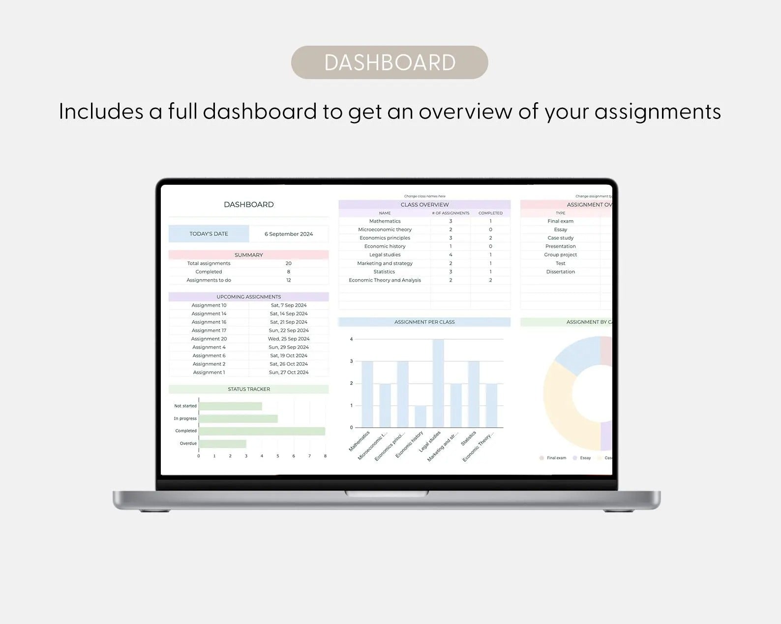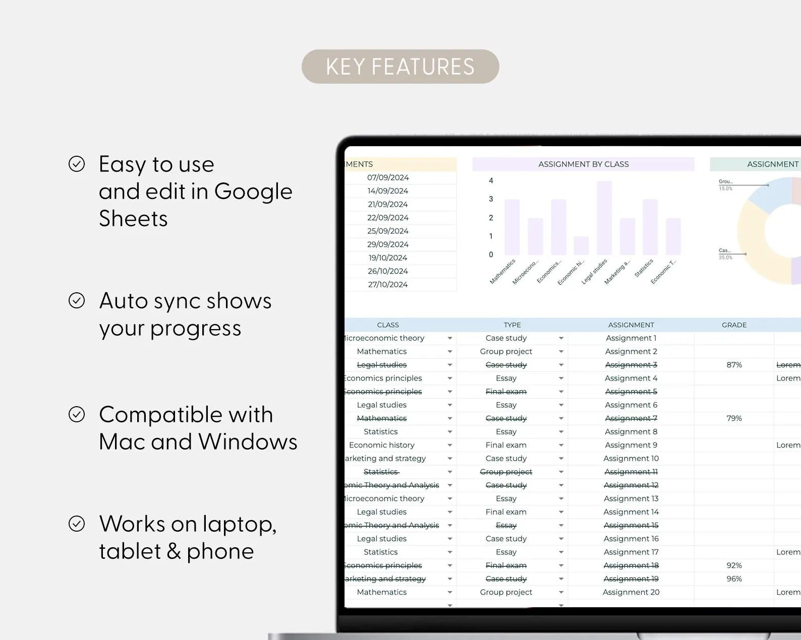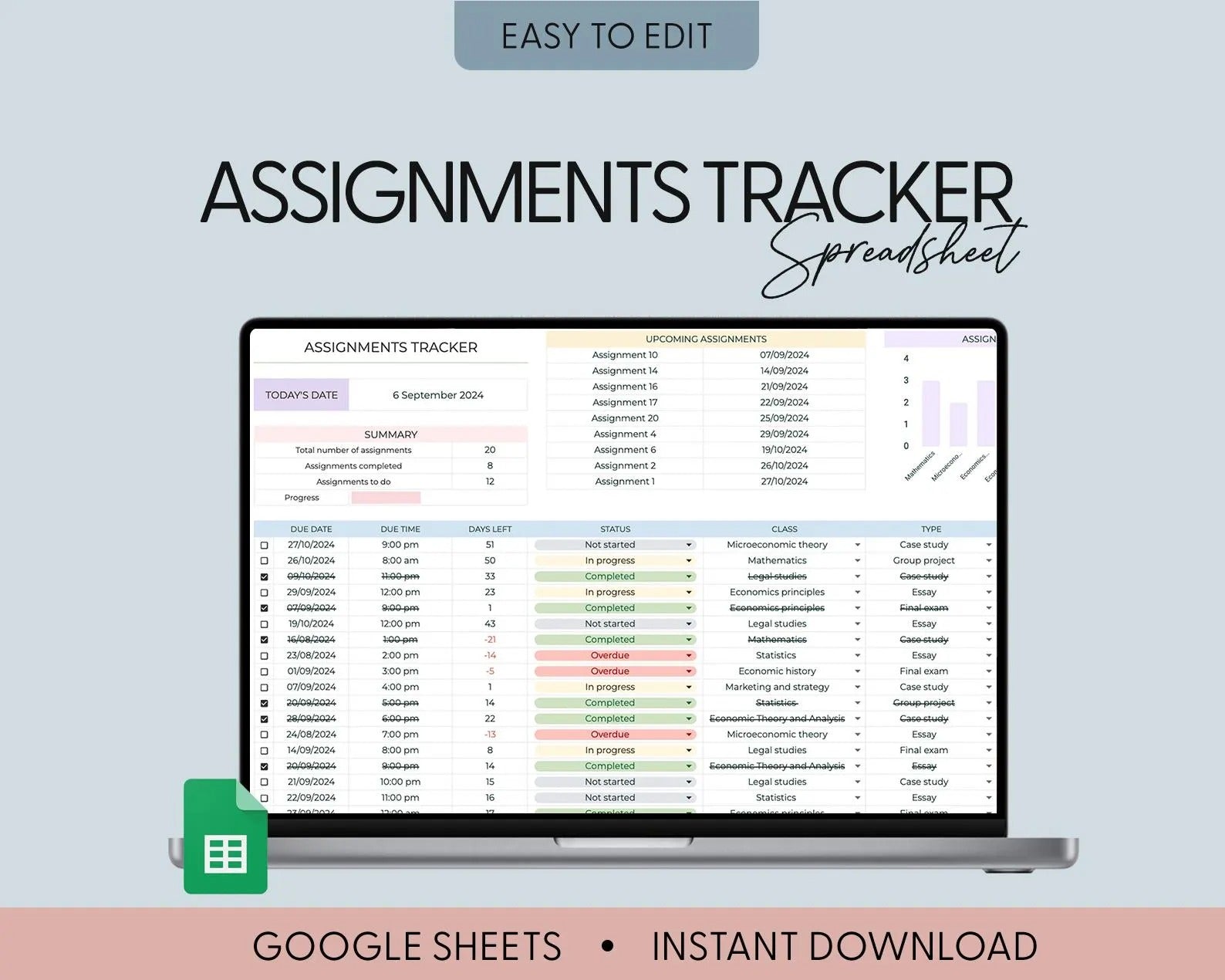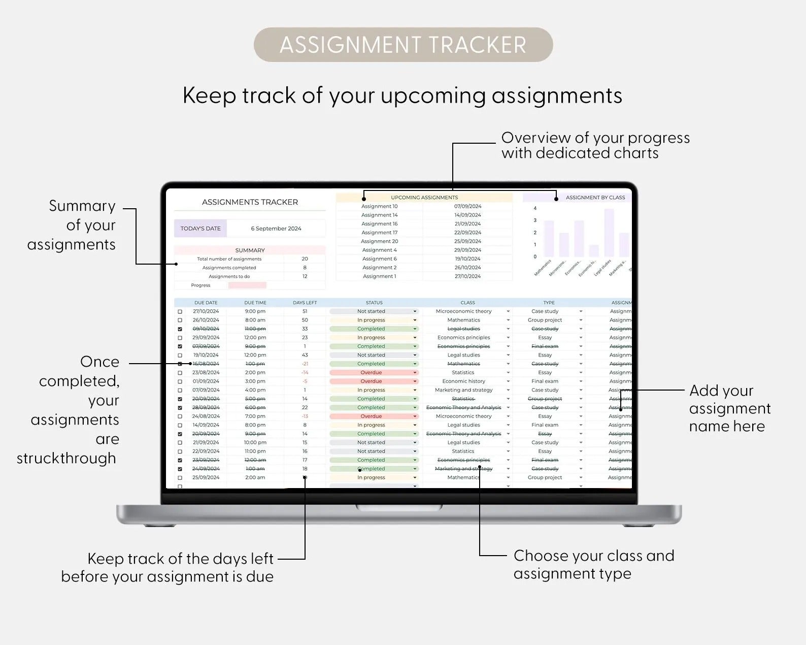 Automatic Deadlines: Set assignment deadlines and the spreadsheet will automatically highlight tasks nearing their due date, ensuring you never miss an important submission.