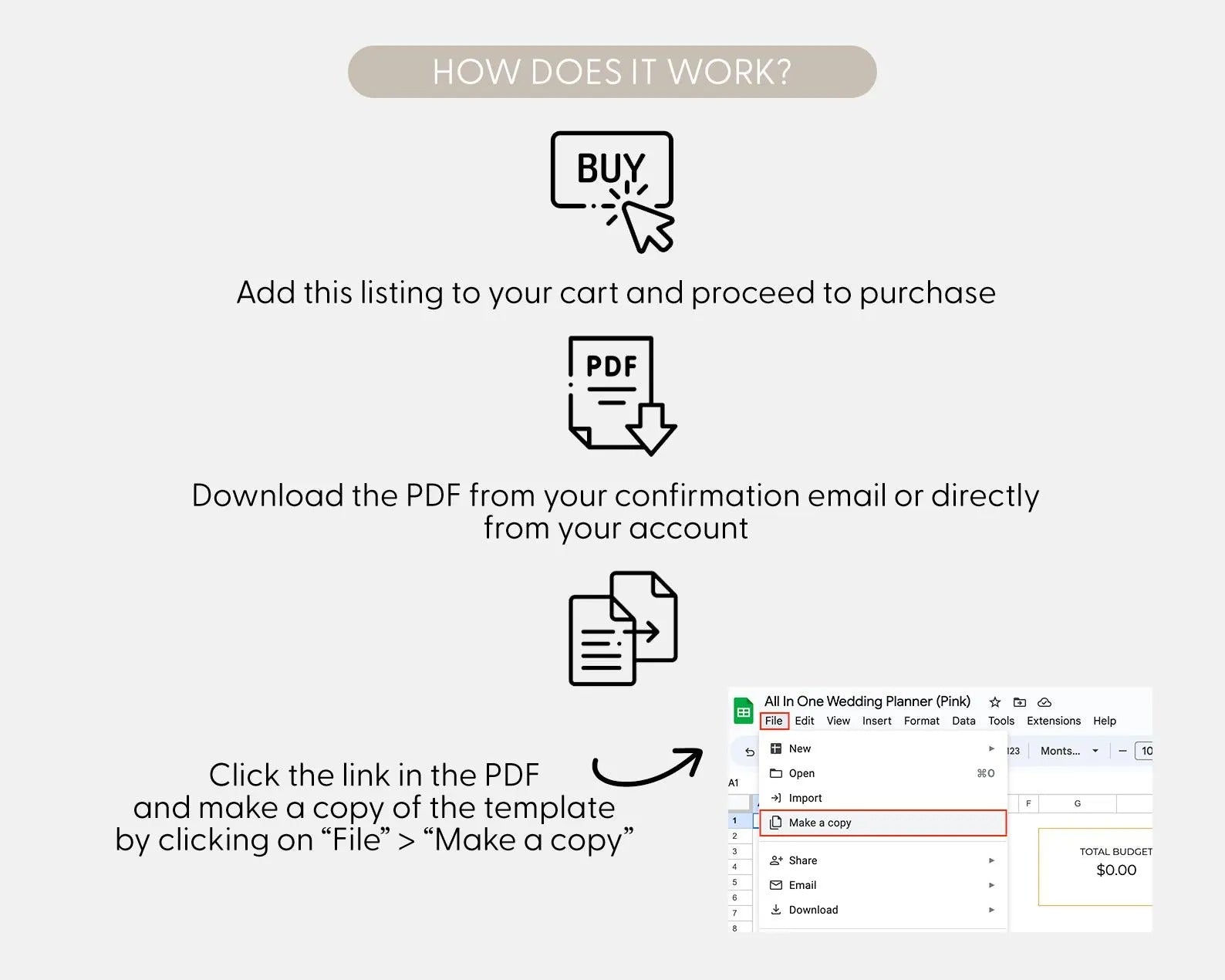 Purchase the Template: Add the product to your cart and complete the checkout process. Upon purchase, you will receive an instant download link to the Google Sheets template.